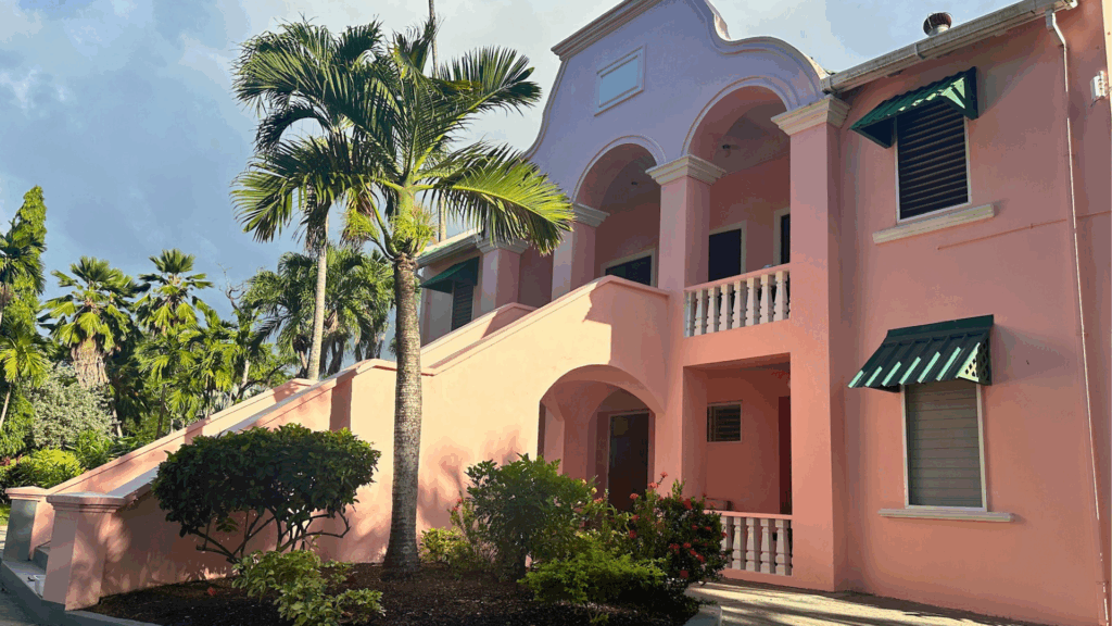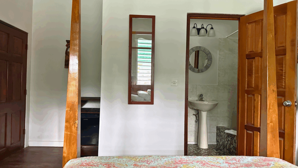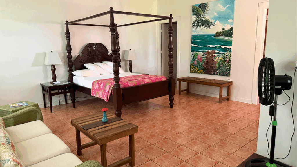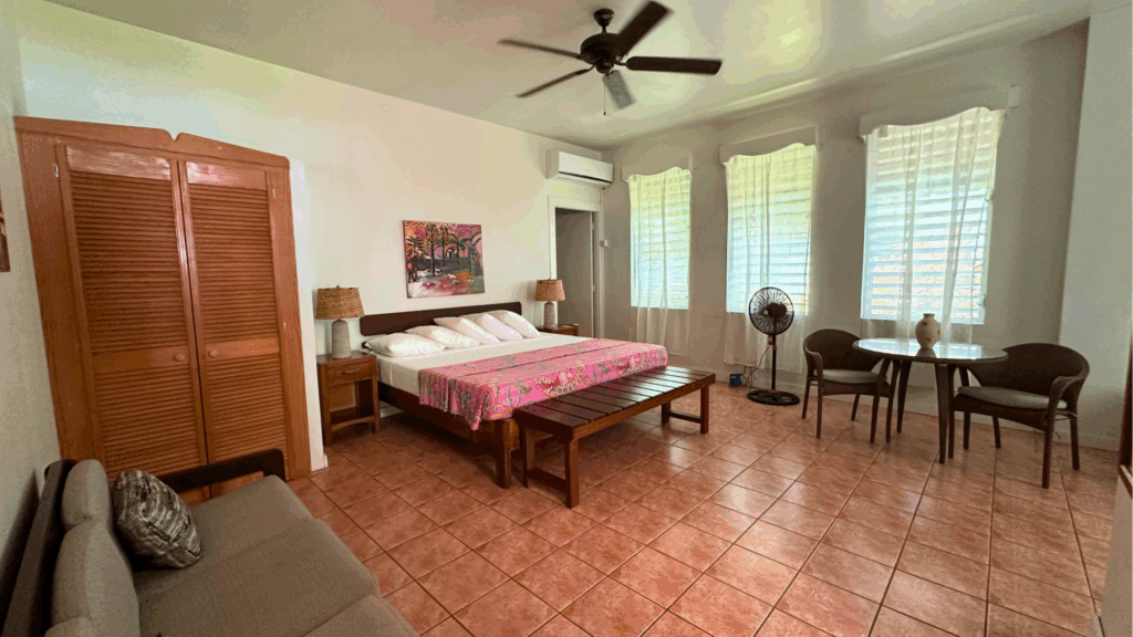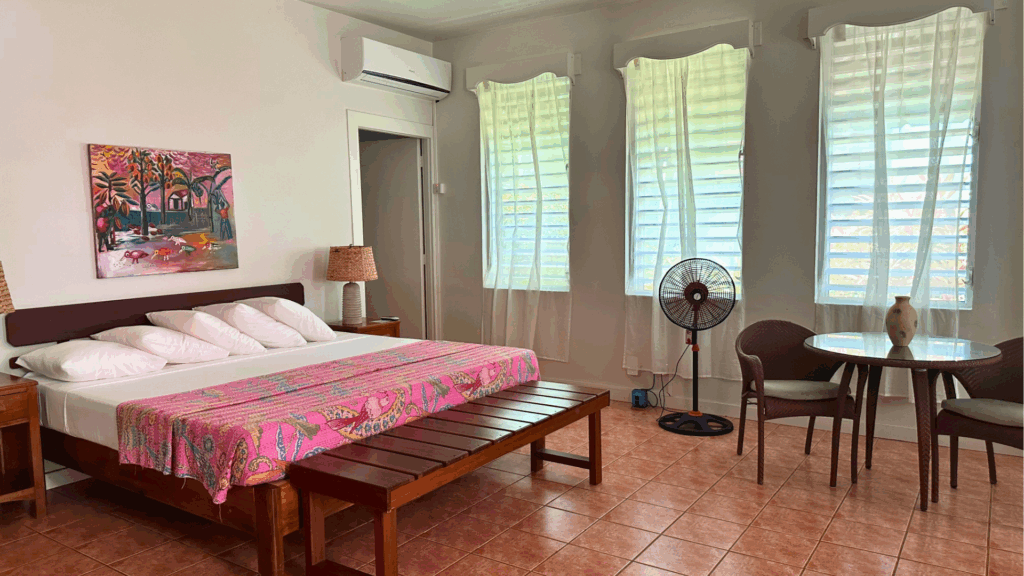 🌸The Pink Room is our Ocean View Queen, tucked away on the ground floor of the Manor House. From the verandah, enjoy calming views of the ocean, or retreat inside to a bright and welcoming space designed for comfort. With both a ceiling fan and an AC unit, you can set the perfect temperature as you relax and recharge.